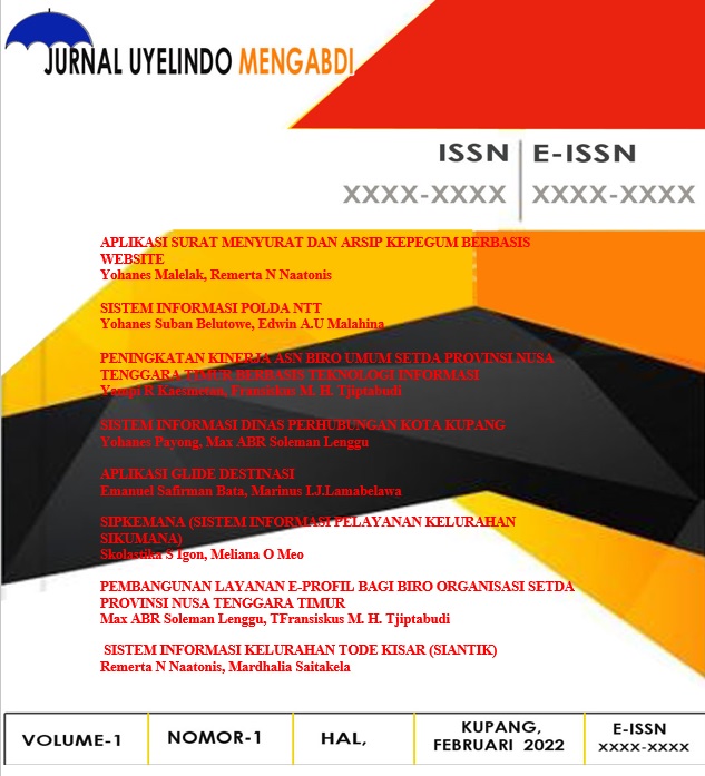 Jurnal Uyelindo Mengabdi merupakan Jurnal Ilmiah untuk menampung hasil pengabdian kepada masyarakata dari Dosen, Praktisi, dan Mahasiswa dalam bidang Teknologi Informasi. Jurnal Uyelindo Mengabdi diterbitkan oleh Lembaga Penelitian, Publikasi dan Pengembangan pada Masyarakat, STIKOM Uyelindo Kupang.